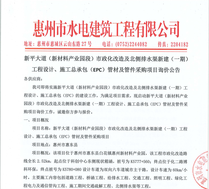 新平大道(新材料產(chǎn)業(yè)園段)市政化改造及北側(cè)排水渠新建(一期)工程設(shè)計、施工總承包(EPC)管材及管件采購項目詢價公告附件:/upload/202501/09/202501091027224112.xls……